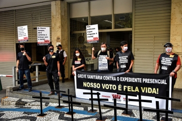 Os servidores do Judiciário Federal em São Paulo fizeram nesta sexta-feira, 7 de agosto, a segunda assembleia geral (imagem) desde o início da deliberação de greve sanitária contra a volta precoce do trabalho presencial nos tribunais. Ainda nesta sexta, o Brasil ocupou pelo segundo dia consecutivo o topo do ranking mundial de mortes diárias pela covid-19, aproximando-se do total de 100 mil mortes desde o início da pandemia – marca que deve ser atingida neste final de semana.