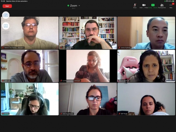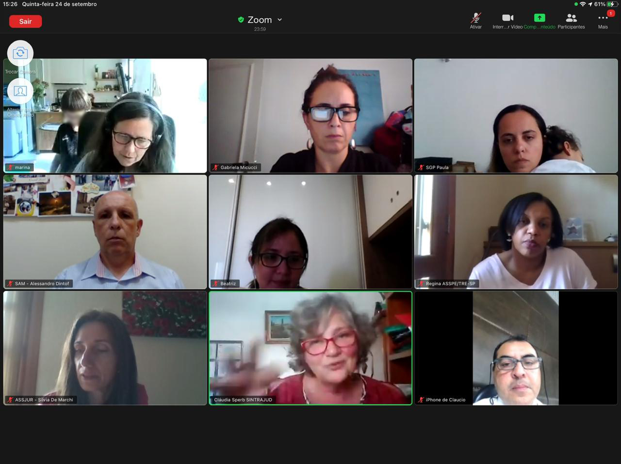Diretores do Sintrajud reuniram-se por videoconferência nesta quinta-feira, 24 de setembro, com o diretor-geral e secretários do TRE, a fim de discutir as condições de trabalho na preparação das eleições de novembro em meio à pandemia de coronavírus, a questão do registro das horas extras dos trabalhadores do Tribunal e a renegociação dos empréstimos consignados dos servidores.
