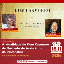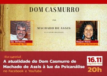 O Sintrajud dá continuidade às suas atividades socioculturais em tempos de distanciamento social com a apresentação, na próxima segunda-feira, 16 de novembro, de uma live com o tema “A atualidade do Dom Casmurro, de Machado de Assis”. O evento começa às 20 horas e terá transmissão pelo site e pelas redes sociais do Sindicato (YouTube e Facebook).A apresentação será feita pelo servidor do TRE e diretor de base do Sintrajud Elizaldo Veríssimo (Ely), formado em Letras pela USP. Segundo Ely, a ideia é discutir não apenas como o romance de Machado de Assis revela o descompasso da sociedade brasileira, mas também como o autor mostra a “subjetividade doentia” do país, numa leitura psicanalítica da obra.