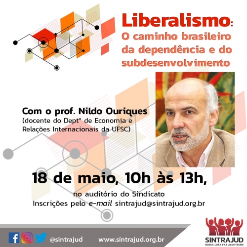 Ouriques ministrará palestra no auditório do Sindicato a partir das 10 horas. Ele vai falar sobre “Liberalismo: o caminho brasileiro da dependência e do subdesenvolvimento”.