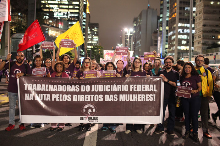 O Coletivo de Mulheres do Sintrajud participou da manifestação que aconteceu na Avenida Paulista. Com faixas e cartazes, servidoras do Judiciário Federal e funcionárias do Sindicato se juntaram à concentração na Praça Oswaldo Cruz, com apresentações culturais, e depois marcharam pela Avenida Paulista em direção ao escritório da Presidência da República.