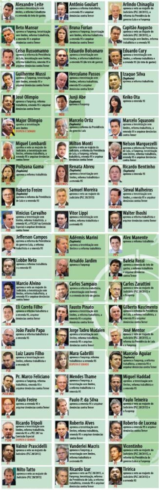 Na conta do Diap não estão os suplentes atualmente sem mandato. A reportagem do Sintrajud incluiu os suplentes paulistas que em algum momento ocuparam cadeiras na Câmara e votaram pela retirada de direitos. Alguns deles assumiram somente em votações críticas, fizeram o ‘serviço sujo’ e devolveram o mandato aos titulares. Agora, voltam a se candidatar.