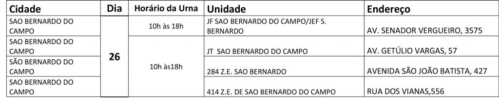 A urna que coletará os votos dos servidores do Judiciário Federal de São Bernardo do Campo será nesta sexta-feira, 26. Houve um erro material no jornal, que constou o dia de votação na cidade seria dia 25. No entanto, a comissão eleitoral já informou os servidores e garantirá o recolhimento dos votos na cidade amanhã, 26, entre 10h e 18h, conforme ficou constando no mapa eleitoral aprovado pela comissão eleitora.