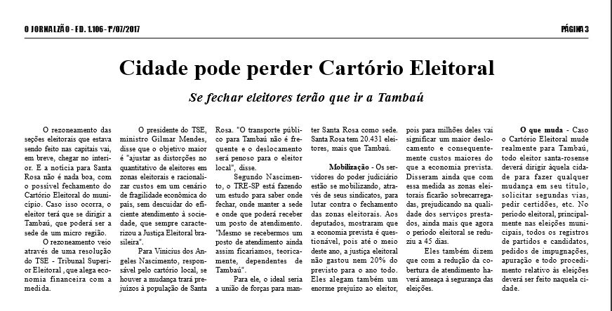 Fechamento de cartório eleitoral de Santa Rosa do Viterbo foi destaque em jornal