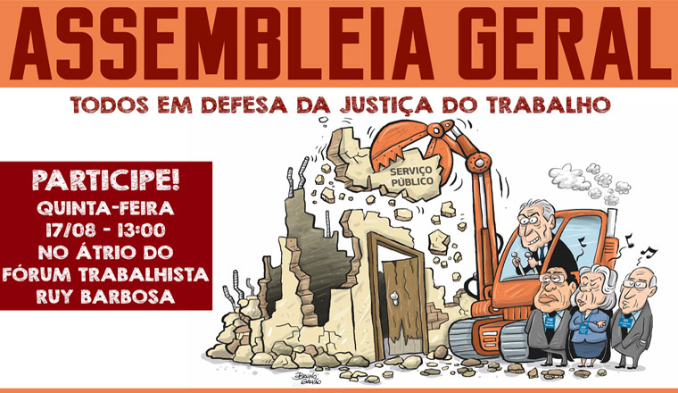 Servidores do TRT realizarão assembleia para debater os ataques à Justiça do Trabalho e aos direitos dos servidores, nesta quinta-feira, 17, às 13h, no Fórum Trabalhista Ruy Barbosa.