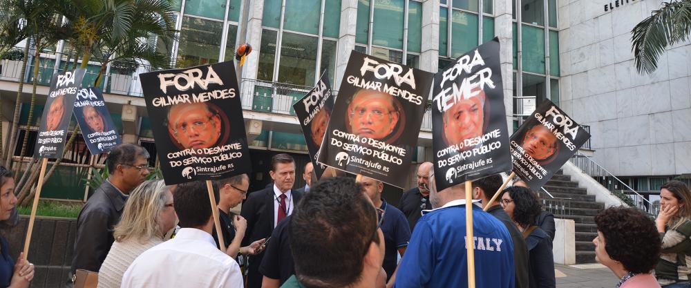 A notícia da agenda de Gilmar Mendes na capital gaúcha só foi anunciada na noite de domingo, 22. Apesar do pouco tempo, o sindicato conseguiu mobilizar a categoria para uma “recepção” ao ministro. Em frente ao TRE-RS, com faixa e cartazes que exigiam “fora, Gilmar”, estavam presentes colegas das justiças do Trabalho, Federal e Eleitoral, além de aposentados. O ato também contou com a presença da Ocupação de Mulheres Mirabal e de representantes dos sindicatos dos Servidores do Ministério Público do Estado do RS (Simpe), dos Servidores da Defensoria Pública do RS (Sindpers), dos Trabalhadores em Saúde Trabalho e Previdência (Sindisprev) e dos Jornalistas do RS.