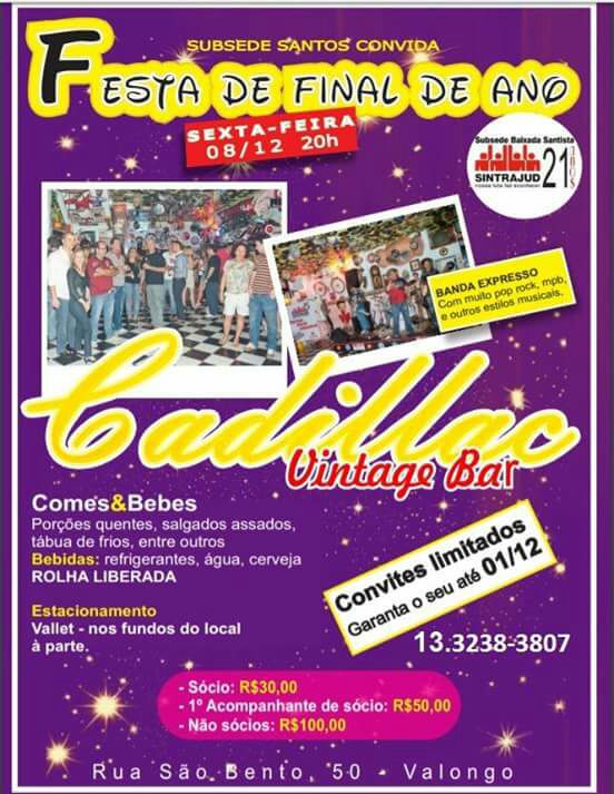 Os servidores do Judiciário Federal na Baixada Santista têm um encontro marcado no dia 8 de dezembro, na Festa de Final de Ano da subsede do Sintrajud. Este ano a festa será animada pela banda Expresso.