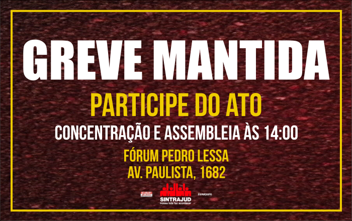 O Sintrajud convoca todos os servidores do Judiciário Federal a manter a greve de 24 horas. No dia 5, estaremos na rua junto com sindicatos de outras categorias, que também manterão suas greves, e o movimento social e popular em defesa da aposentadoria, do serviço público e contra a reforma trabalhista. A concentração dos servidores do Judiciário Federal será às 14h, em frente ao Fórum Pedro Lessa (Av. Paulista, 1682), com assembleia geral para avaliar a mobilização e discutir os próximos passos da luta. O ato unificado acontecerá às 16h, no vão do MASP.