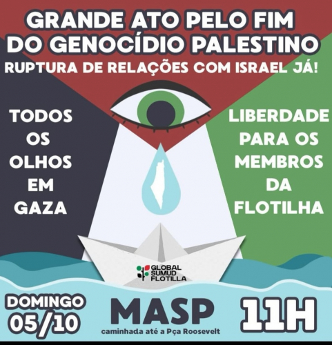 Na capital paulista, a Frente Palestina de São Paulo está convocando um grande ato para o dia 5 de outubro, às 11h, em frente ao Masp, na Avenida Paulista. De lá, a manifestação seguirá em passeata até a Praça Roosevelt.