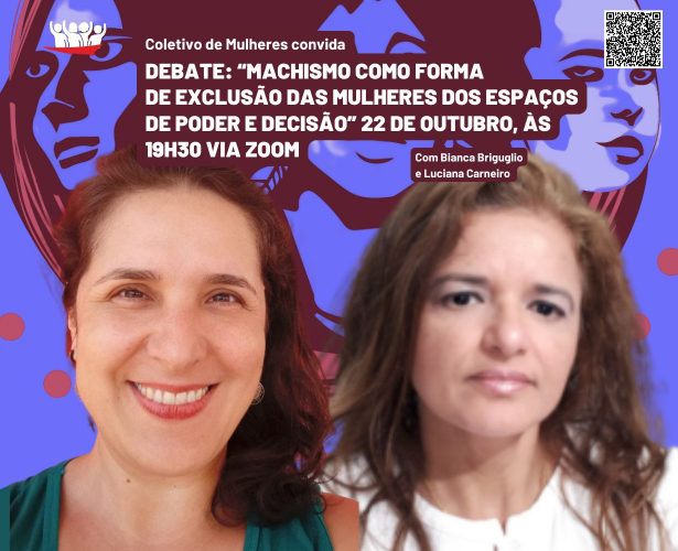 O Coletivo de Mulheres do Sintrajud - Mara Helena dos Reis e a diretoria do Sindicato convidam a categoria a participar da atividade on-line "Machismo como forma de exclusão das mulheres dos espaços de poder e decisão". A atividade acontece no dia 22 de outubro (quarta-feira), a partir das 19h30, ministrada pela socióloga Bianca Briguglio.