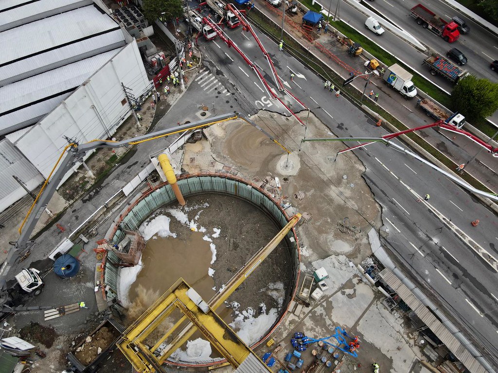 Na manhã desta terça-feira, 1 de fevereiro, uma parte da pista local da Marginal Tietê desabou, abrindo uma gigantesca cratera no trecho onde ocorriam as obras da linha 6-laranja do metrô de São Paulo, ainda sem previsão de retomada quando este texto foi publicado. Informação divulgada pelo portal 'G1', fornecida pela empresa responsável pelo reparo, dá conta de que a quantidade de concreto utilizado para cobrir o buraco seria suficiente para erguer seis prédios de 16 andares.