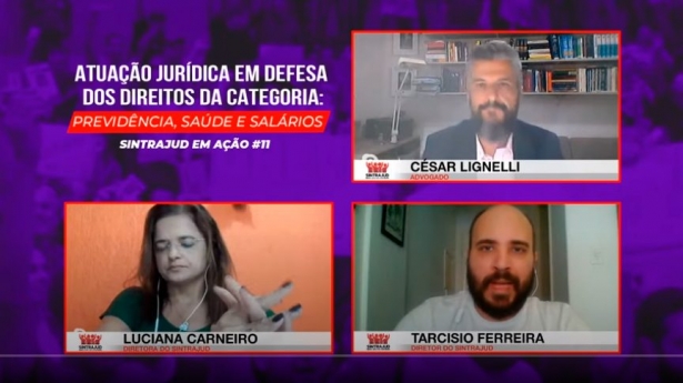 Após quase um mês de isolamento social e teletrabalho, a décima primeira live do Sintrajud foi um bate-papo sobre a atuação jurídica em defesa dos direitos da categoria. A transmissão ao vivo que aconteceu na última segunda-feira, 13 de abril, teve a presença do advogado César Lignelli, coordenador do departamento Jurídico do Sindicato, e dos diretores Luciana Carneiro e Tarcisio Ferreira.