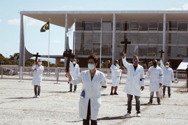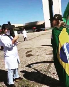 Em Brasília, na sexta-feira, 50 trabalhadores da área de Enfermagem realizaram um ato que acabou repercutindo até internacionalmente após os profissionais serem agredidos por um grupo de apoio do presidente da República. Os enfermeiros e auxiliares estavam em frente ao Palácio do Planalto num protesto silencioso, exibindo cruzes de papelão que representavam os mortos - trabalhadores da saúde e população em geral - pelo coronavírus. Nas faixas utilizadas, lia-se "A vida dos profissionais de Enfermagem importam #FiqueEmCasa" e "Enfermagem em luto pelos profissionais vítimas da Covid-19 #FiqueEmCasa".