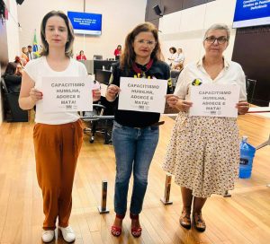 As diretoras do Sintrajud Rosana Nanartonis (TRE/aposentada) e Isabella Leal (TRT-2), e da Federação Nacional (Fenajufe) Luciana Carneiro (TRF-3), acompanharam a reunião da Comissão de Defesa dos Direitos das Pessoas com Deficiência da Assembleia Legislativa do Estado de São Paulo (Alesp), nessa terça, 19 de setembro, onde seria votada a moção de repúdio ao capacitismo (nº 147/2023). O documento deverá ser apreciado num próximo encontro, ainda sem data prevista.