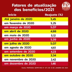 A atualização da tabela corrige também os benefícios previdenciários de quem ingressou no serviço público a partir de 2004, já sob os efeitos da perda da paridade imposta pela Emenda Constitucional 41/2003, e se aposentou a partir de 1º de janeiro de 2020. Confira abaixo a tabela dos fatores de de reajuste dos benefícios concedidos de acordo com as respectivas datas de início, aplicáveis a partir de janeiro de 2021: