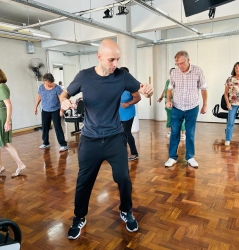 Em clima pré-junino, logo após a reunião, aconteceu gratuitamente a aula de dança, com o professor e coreógrafo Diego Carlos Bellarosa. “O movimento corporal contribui para que cada pessoa adquira o autoconhecimento e desenvolva a sua criatividade, auxiliando ainda na integração social, física e emocional”, enfatizou o professor que dá aula para os aposentados e pensionistas do Sintrajud há mais de um ano. Ele não abre mão de possibilitar ainda durante as atividades a alegria e a diversão, fundamentais para o desenvolvimento da dança e aprendizagem dos alunos.