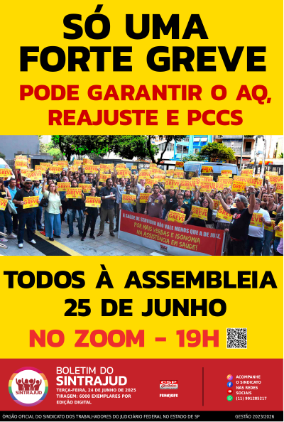 A diretoria do Sintrajud reforça o chamado à assembleia estadual on-line desta quarta-feira (25 de junho), para que a categoria conheça a tramitação da proposta aprovada no último dia 18 pelo Supremo Tribunal Federal, antes de virar realidade no bolso de trabalhadoras e trabalhadores.