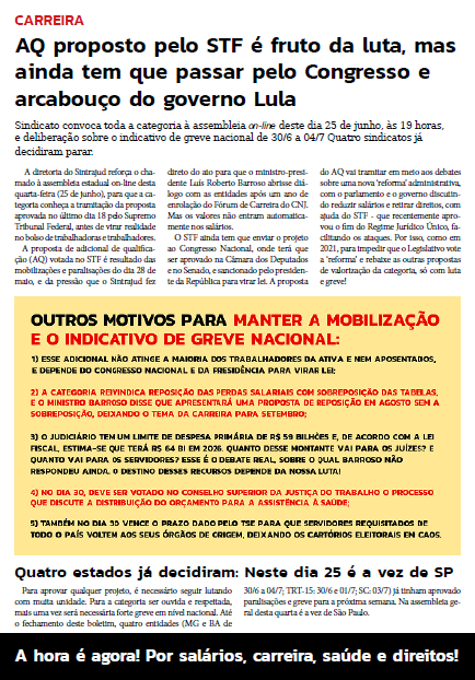 Para aprovar qualquer projeto, é necessário seguir lutando com muita unidade. Para a categoria ser ouvida e respeitada, mais uma vez será necessária forte greve em nível nacional. Até o fechamento deste boletim, quatro entidades já tinham aprovado paralisações e greve para a próxima semana (MG e BA de 30/6 a 04/7; TRT-15: 30/6 e 01/7; SC: 03/7). Na assembleia geral desta quarta é a vez de São Paulo. A hora é agora! Por salários, carreira, saúde e direitos!