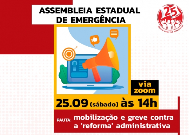 Diante das manobras do governo e sua base aliada na Câmara dos Deputados, a diretoria do Sintrajud convoca toda a categoria a participar de assembleia estadual online para debater a necessidade de uma greve nacional do funcionalismo contra a aprovação da 'reforma' administrativa. A assembleia acontece via plataforma Zoom, neste sábado (25 de setembro), às 14 horas.