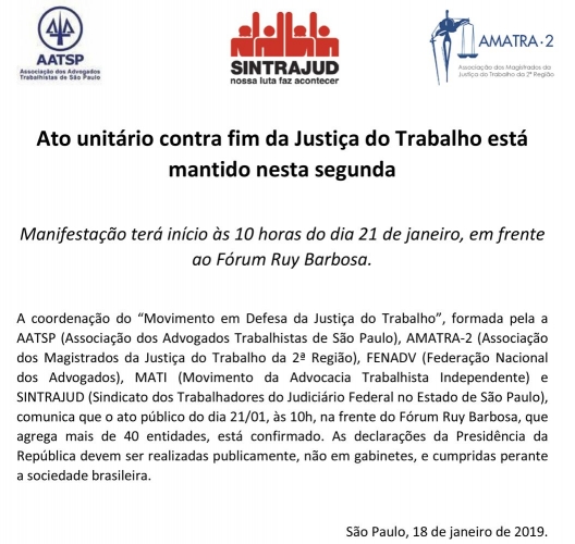 Nesta segunda-feira, 21, o primeiro grande ato em defesa da Justiça do Trabalho dá início a uma série de atividades em nível nacional. Organizada após declarações do presidente da República, Jair Bolsonaro, de que pretende enviar ao Congresso Nacional uma proposta para acabar com esse ramo do Judiciário, especializado na regulação das relações trabalhistas, a iniciativa foi impulsionada pelos representantes da população usuária da JT, os advogados trabalhistas, e imediatamente abraçada por entidades de servidores, juízes e mais de 30 segmentos da sociedade civil.