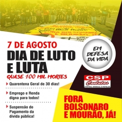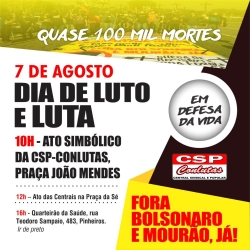 A CSP-Conlutas e mais dez centrais sindicais realizam mais um dia de luta em defesa da vida e pelo Fora Bolsonaro e Mourão nesta sexta-feira, 7 de agosto. Será o segundo dia de mobilização organizado pelas centrais, o primeiro aconteceu no dia 10 de julho, contra a falta de política do governo federal no combate a pandemia, que já causou a morte de mais de 90 mil brasileiros.O Sintrajud estará participando das manifestações em frente ao Fórum João Mendes (na praça de mesmo nome, próximo à Sé), às 10 horas. Ao meio-dia, o protesto unificado acontece em frente às escadarias da Catedral, reunindo as diversas categorias e centrais - e o Sindicato também estará presente.