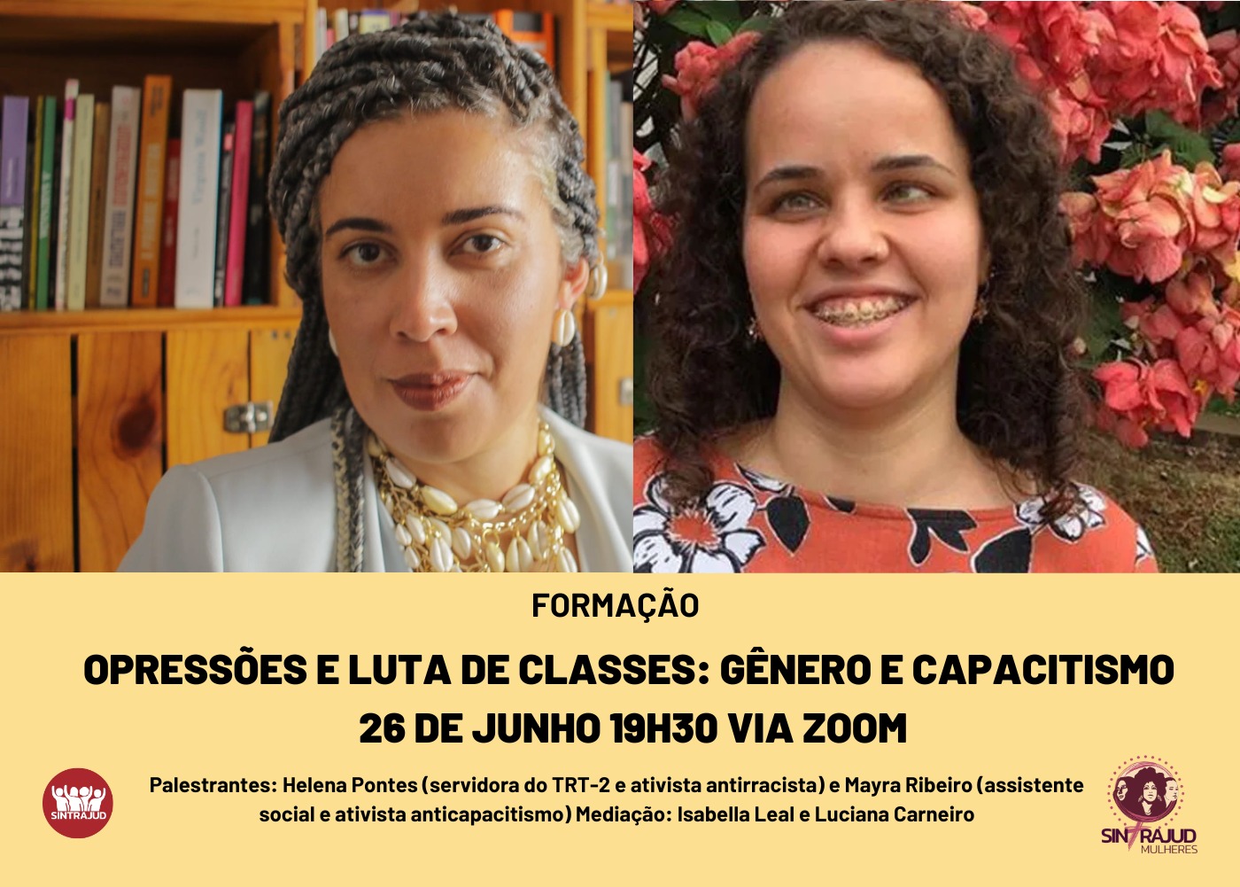 SERVIÇO:Formação Opressões e luta de classes: gênero e capacitismo26 de junho - 19h30Via ZoomPalestrantes: Helena Pontes (servidora do TRT-2 e ativista antirracista) e Mayra Ribeiro (assistente social e ativista anticapacitismo)