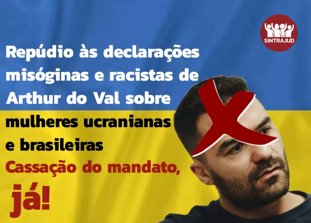 Durante o seminário realizado pelo Coletivo de Mulheres do Sintrajud - Mara Helena dos Reis no último sábado, 5 de março, foi aprovada manifestação de repúdio do Sindicato à conduta do deputado estadual e então pré-candidato ao governo do Estado de São Paulo, Arthur do Val. Conhecido como 'Mamãe falei' e integrante do Podemos e do Movimento Brasil Livre (MBL), Arthur deflagou um incidente diplomático entre o Brasil e a Ucrânia e despertou repúdio internacional ao afirmar num áudio enviado a amigos, que vazou, que as mulheres ucranianas "são fáceis porque são pobres".