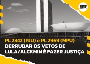 "PL 2969 e PL 2342: derrubar os vetos de Lula/Alckmin é fazer justiça". A frase expressa uma campanha que envolve servidores do Ministério Público da União e do Judiciário Federal que estará em pauta no Congresso Nacional, na sessão convocada pelo presidente do Senado, Rodrigo Pacheco (PSD-MG), para esta quarta-feira, dia 4 de outubro de 2023.