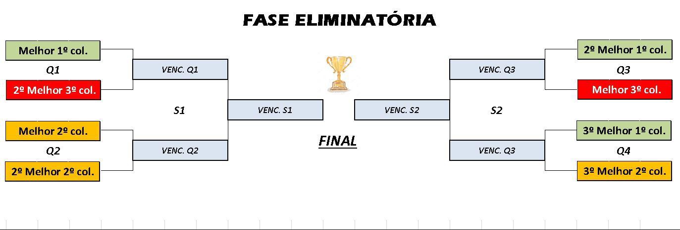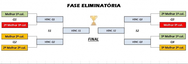 Classificam-se para as quartas de final os dois primeiros colocados de cada grupo e ainda os dois melhores dentre os terceiros colocados. A fase eliminatória ficou assim: