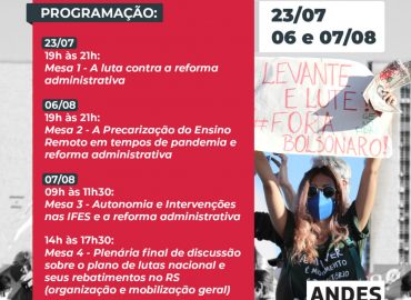 Outra diretora do Sintrajud, Luciana Carneiro, participou na última terça-feira, 20 de julho, de uma live da Frente Parlamentar Mista do Serviço Público sobre a reforma administrativa, com a participação de Vladimir Nepomuceno, servidor federal aposentado.
