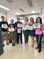 A visita na Justiça Federal de Ribeirão contou com a presença das diretoras do Sintrajud Anna Kerenina Macedo, Rosana Nanartonis e o coordenador da Federação Nacional da categoria, Fabiano dos Santos, servidor João Carlos Peres – o Johnny –, da servidora da Justiça Estadual Sônia Silva e Mayra R. de Oliveira, que é deficiente visual e integrante da Frente das Pessoas com Deficiência do PSOL. O grupo ouviu as principais queixas dos servidores que demostraram satisfação por fazer parte de um Sindicato combativo.