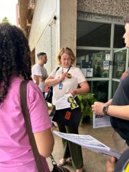 A diretora Rosana Nanartonis panfleta no hall do prédio do
