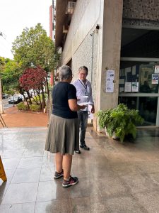 Como forma de fortalecer a atuação do Sindicato junto às servidoras e servidores do interior, o Sintrajud esteve mais uma vez na Justiça Federal de Ribeirão Preto em atividade de mobilização. Além de distribuir boletins na entrada do prédio, em ação corpo-a-corpo junto aos servidores, a diretoria dialogou sobre assédio moral e atualizou as informações sobre o caso de capacistismo que envolve o juiz-auxiliar da presidência do TRF-3 e presidente do JEF/Ribeirão Preto, Paulo Arena Filho; conversão da 5ª Vara; derrubada dos vetos; antecipação do reajuste salarial e a PEC 32, 'reforma administrativa'. A ação ocorreu na segunda, 9 de outubro.
