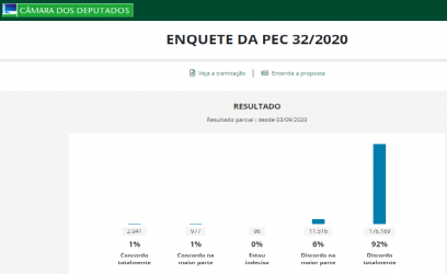 Em consulta pública no site da Câmara dos Deputados, 92% afirmam discordar totalmente da PEC 32