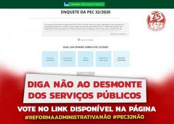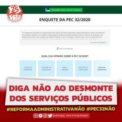 A diretoria do Sintrajud convida mais uma vez toda a categoria a participar da consulta pública no site da Câmara dos Deputados reafirmando o repúdio a Proposta de Emenda Constitucional 32/2020 (a 'reforma' administrativa). A consulta está aberta no site desde setembro e já conta com mais de 170 mil votos, dos quais, até o fechamento desta matéria, 92% discordam totalmente da ‘reforma’ administrativa.