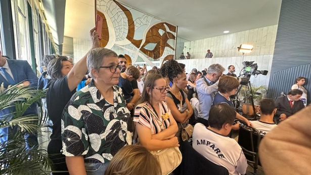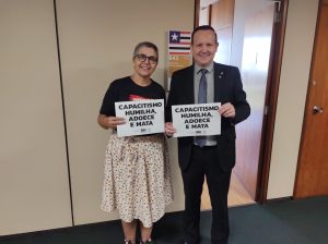 O 21 de setembro marca a luta pelos direitos das pessoas com deficiência e contra o capacitismo, e neste ano contou com o lançamento da Frente Parlamentar em Defesa dos Direitos das Pessoas com Deficiência, no dia 20, e ato na data comemorativa, ocorrido logo pela manhã no Salão Nobre da Câmara. Além da direção da federação e do Sintrajud, participaram do dia de luta representantes do Sindjufe/BA, Sisejufe/RJ, Sindjufe/MS, Sindjufe/MT, Sintrajufe/CE, Sindjuf PA-AP, Sitraam/AM, Sitraemg/MG e Sintrajufe/RS. O Sindicato esteve representado pela dirigente Rosana Nanartonis (aposentada do TRE) e Fabiano dos Santos, dirigente da Fenajufe e da CSP-Conlutas, central sindical à qual o Sintrajud é filiado.