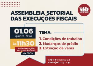O Sintrajud está convocando assembleia setorial das Execuções Fiscais Federais para o dia de junho, quinta-feira, a partir das 11h30min da manhã.