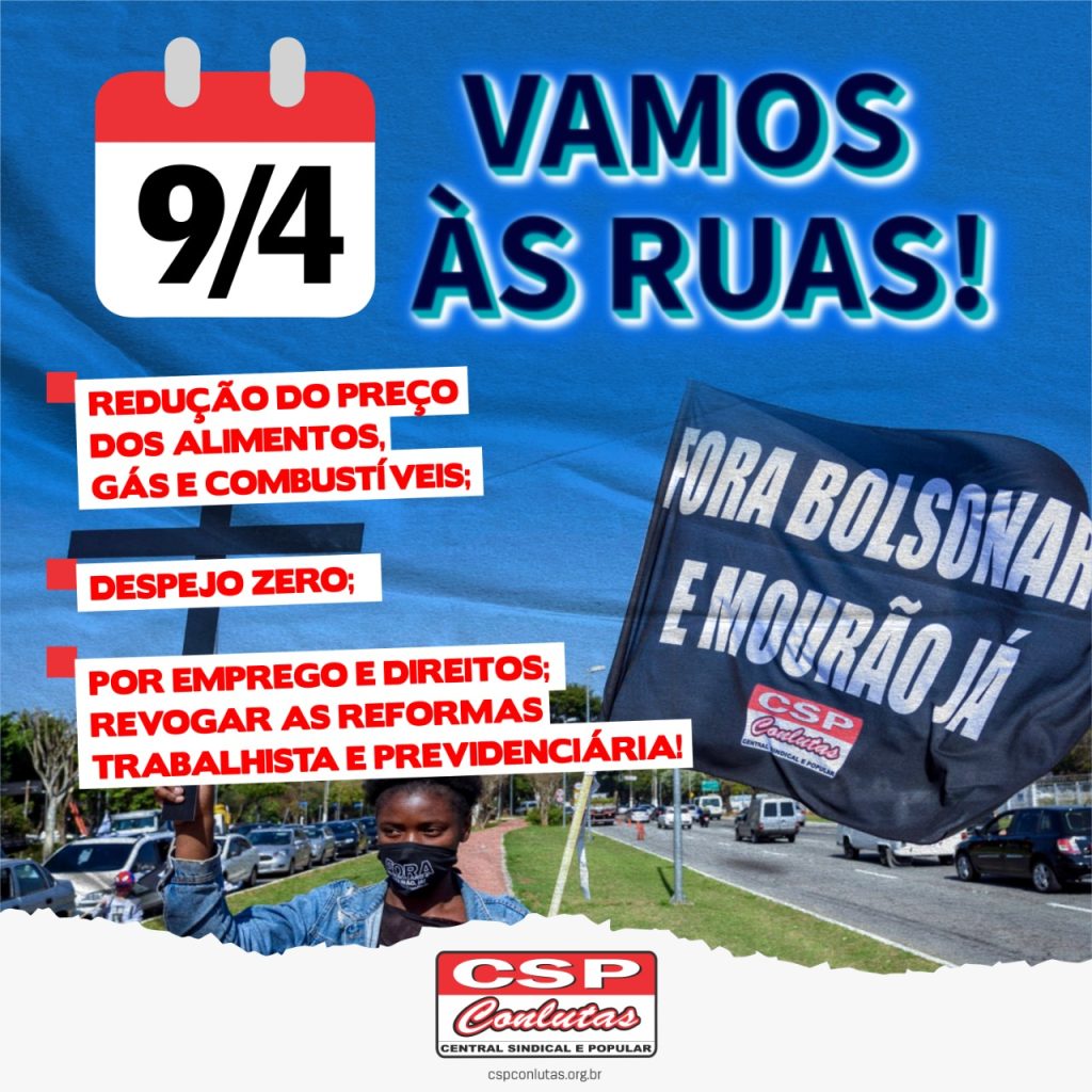 As ruas de várias cidades do país estarão novamente ocupadas no próximo sábado, 9 de abril, pela Campanha Nacional Fora Bolsonaro. “A luta para tirar Bolsonaro e Mourão segue sendo uma tarefa urgente e imediata em defesa da vida, dos empregos e direitos”, diz a CSP-Conlutas, central a que o Sintrajud é filiado e uma das organizadoras das manifestações.