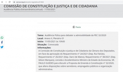 O ministro Paulo Guedes deverá falar sobre a 'reforma' administrativa (PEC 32/2020) na Comissão de Constituição e Justiça da Câmara nesta terça-feira, dia 11 de maio, a partir das 10 horas da manhã. A participação na comissão que analisa a admissibilidade da proposta ocorrerá pouco mais de duas semanas após o ministro defender a privatização da saúde pública, substituindo o serviço público pela distribuição de vales (voucher) para a população usar nos hospitais privados quando precisar de atendimento.