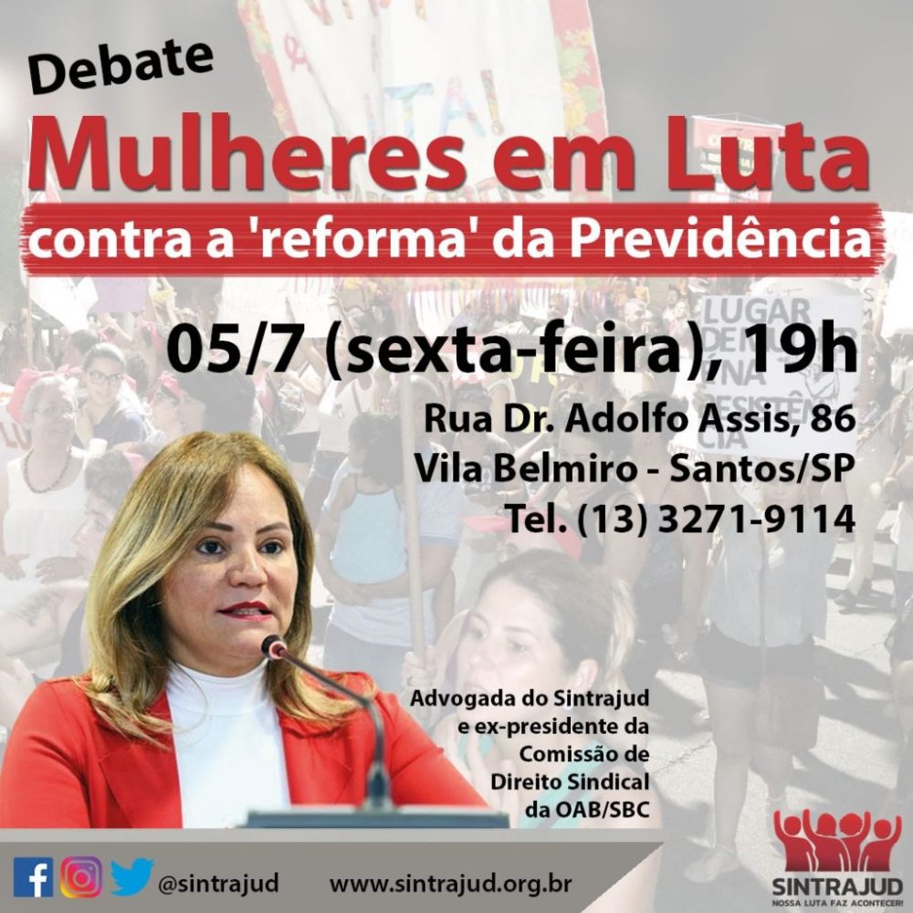 A diretoria do Sintrajud convida toda a categoria a participar do debate sobre o impacto da ‘reforma’ da Previdência proposta pelo governo Bolsonaro sobre a vida das mulheres, abordado pela advogada Eliana Ferreira, do Departamento Jurídico do Sindicato. O evento acontecerá na sexta-feira, 5 de julho, às 19 horas, na subsede na Baixada Santista.