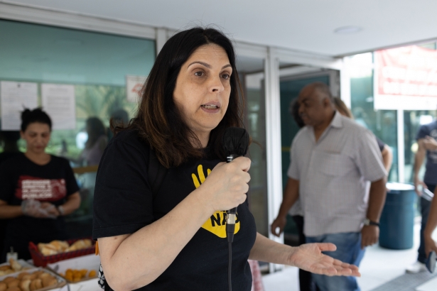 A diretora do Sindicato e oficiala de justiça Ana Silvia Poço em ato por mais verbas para a assistência médica e odontológica para os servidores, no ano passado, em frente ao TRF-3 (Foto: Kit Gaion)