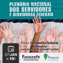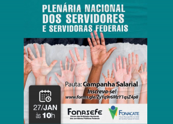 A mobilização das categorias do funcionalismo público federal em defesa da recomposição de perdas inflacionárias acumuladas nos últimos anos será tema de uma Plenária Nacional Unificada que acontece em plataforma virtual a partir das 10 horas desta quinta-feira, 27 de janeiro. A atividade é convocada pelo Fórum das Entidades Nacionais de Servidores Federais (Fonasefe) e o Fórum Nacional Permanente de Carreiras Típicas de Estado (Fonacate), e será a primeira atividade do ano que reunirá servidores e servidoras dos três poderes da República.