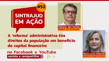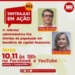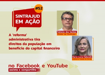 Os impactos da ‘reforma’ administrativa na vida da população e os benefícios que serão direcionados para o capital financeiro serão o tema da live do Sintrajud que acontece nesta terça-feira, 10 de novembro, às 18h, com transmissão no Facebook, YouTube e aqui pelo site.