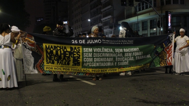 Pelo quarto ano consecutivo, cerca de 7 mil mulheres negras encheram as ruas do centro da capital nesta quinta-feira para denunciar as violências potencializadas pelas condições de gênero e raça impostas no Brasil à população negra. A manifestação organizada pela articulação de coletivos Marcha das Mulheres Negras de São Paulo celebrava o 25 de julho: dia da mulher negra latino-americana e caribenha e de Tereza de Benguela (primeira liderança quilombola feminina reconhecida na historiografia e legislação brasileira, que será homenageada pelo Coletivo de Mulheres do Sintrajud neste sábado e domingo, 27 e 28 de julho).