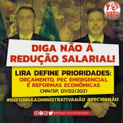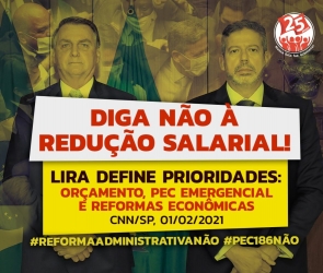 Os dois concorrentes ao comando da Câmara dos Deputados ainda defendem a aprovação da chamada 'PEC Emergencial' (Proposta de Emenda Constitucional 186/2019), que autoriza a redução de salários e jornadas do funcionalismo em até 25% de forma automática em situação de crise fiscal. Assim que foi eleito, Arthur Lira (PP/AL) concedeu entrevista à 'CNN Brasil' e afirmou que esta é sua prioridade, mais uma vez tentando jogar a população contra os servidores ao associar a suposta "necessidade" de cortar salários do funcionalismo à extensão do auxílio emergencial para brasileiros em situação de vulnerabilidade diante da pandemia.