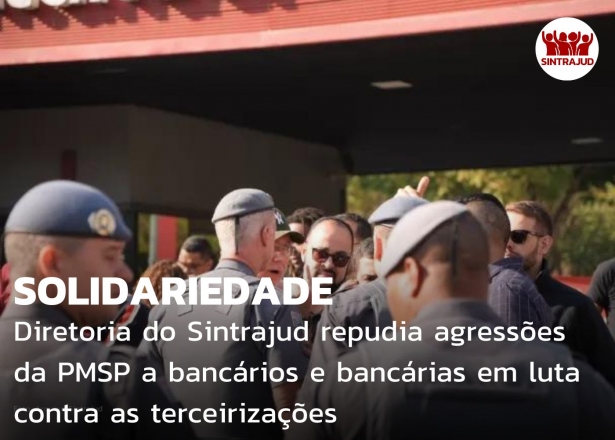 A diretoria do Sintrajud manifestar seu repúdio à ação truculenta da PM, que estava a serviço da direção do banco atentando contra a democracia. E reiteramos nosso apoio a todas as lutas contra a terceirização e nos solidarizamos com o conjunto da categoria bancária e a direção do Sindicato dos Bancários de São Paulo.