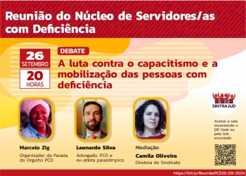 O Núcleo de Servidores e Servidoras com Deficiência do Sintrajud se reúne nesta quinta-feira (26 de setembro) para um debate sobre a luta contra o capacitismo e a mobilização das pessoas com deficiência. Com a participação do organizador da Parada do Orgulho PCD, Marcelo Zig, e do advogado PCD e ex-atleta paraolímpico Leonardo Silva. Na mediação, a diretora e servidora do TRT-2 Camila Oliveira.