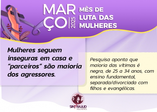Perfil dos principais autores de violência e locais de ocorrênciaA violência contra a mulher geralmente é praticada por homens que conhecem e convivem com as vítimas. Segundo os dados da pesquisa, dentre os principais autores, 40% é parceiro íntimo; 26,8% é ex-parceiro íntimo; 7,6% é amigo ou conhecido; e 5,2% é o pai ou a mãe.Mais da metade das agressões ocorrem no ambiente doméstico, com um percentual de 57% nas residências, 11,6% na rua, 5% na internet/redes sociais, 3,3% no bar/balada e 2,3% no trabalho. Mulheres sindicalistas em luta!A realidade da vitimização das mulheres é alarmante e ainda é preciso muito enfrentamento para acabar com as opressões que, embora sejam proibidas por lei, são praticadas estruturalmente na nossa sociedade.No Sintrajud, o Coletivo de Mulheres - Mara Helena dos Reis mobiliza a categoria no combate a violência e desigualdade de gênero. O Coletivo esteve presente ao ato unificado pelo Dia Internacional de Luta das Mulheres Trabalhadoras, dia 8 de março, na Avenida Paulista. Mulheres da categoria judiciária se somaram também às colegas previdenciárias e servidoras da saúde em nível federal para cobrar direitos e denunciar o machismo, o racismo, a LGBTfobia e o capitalismo.Confira as fotos do ato unificado pelo Dia Internacional de Luta das Mulheres:[gallery columns="2" size="medium" ids="78077,78076,78080,78078,78081,78079,78082,78083"]
