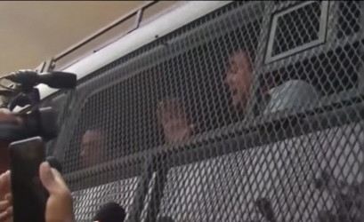 O deputado Glauber Braga (à direita na imagem) e estudantes dentro do ônibus do Batalhão de Choque da PMRJ (Foto: Reprodução BandNews)