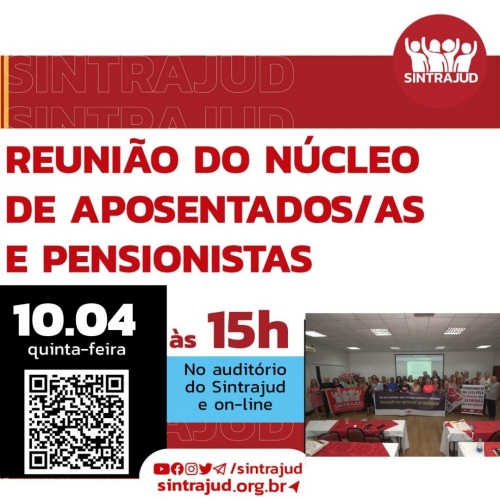 A reunião do Núcleo de Aposentadas, Aposentados e Pensionistas do Sindicato acontece nesta quinta-feira (10 de abril) em formato presencial com possibilidade de participação on-line. A atividade começa às 15 horas, na sede do Sintrajud, no Centro de São Paulo (Rua Antônio de Godói, 88, 15º andar), com informes sobre as lutas gerais da categoria e as questões específicas por Tribunal.
